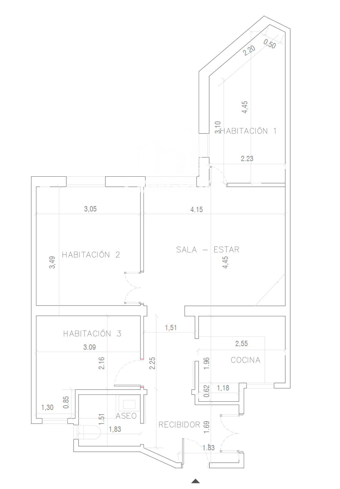 - 3 habitaciones: 1 doble exterior a fachada interior, 1 individual exterior a fachada interior y 1 individual interior a patio de luces